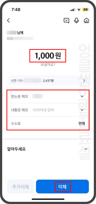 4. 보내는 금액과 받는분 메모(받는 사람 문자에 찍히는 이름), 내 통장 메모(내 통장에 찍히는 이름), 수수료를 확인하고 이체 버튼을 클릭합니다.