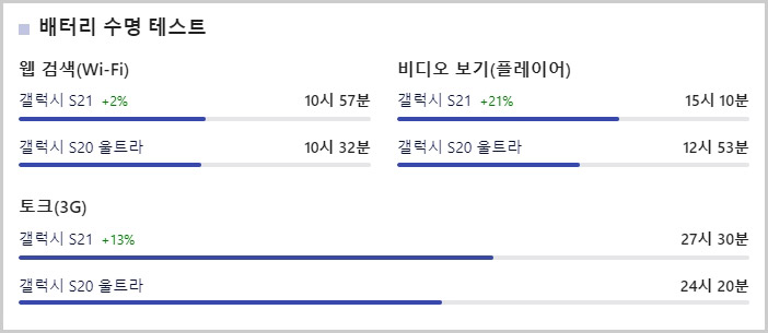 배터리 수명 테스트 표를 확인해 보면 갤럭시 S21이 효율이 조금 더 잘 나오는 것을 확인하실 수 있습니다. 위에서 언급한 대로 S20 울트라가 배터리 용량이 더 크지만 화면 밀도나 크기에 따른 소모가 더 크기 때문에 효율은 S21 쪽이 더 낫습니다.