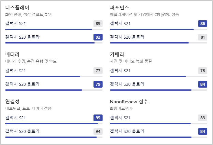 벤치마크 점수를 비교해보면 화면 품질이나 색상 정확도 밝기 등 디스플레이 점수는 갤럭시 S20울트라가 조금 더 높고 게임이나 앱에서의 CPU/GPU 성능은 갤럭시 S21이 조금 더 높습니다.