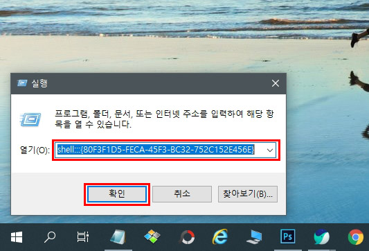 실행 창이 뜨면 "shell:::{80F3F1D5-FECA-45F3-BC32-752C152E456E}"을 입력하고 확인 버튼을 눌러 줍니다.