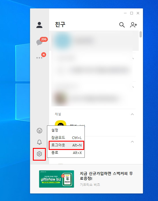 카카오톡 PC버전은 정말 간단한데 톱니바퀴 모양 설정 버튼을 클릭 후 로그아웃을 누르시면 됩니다.