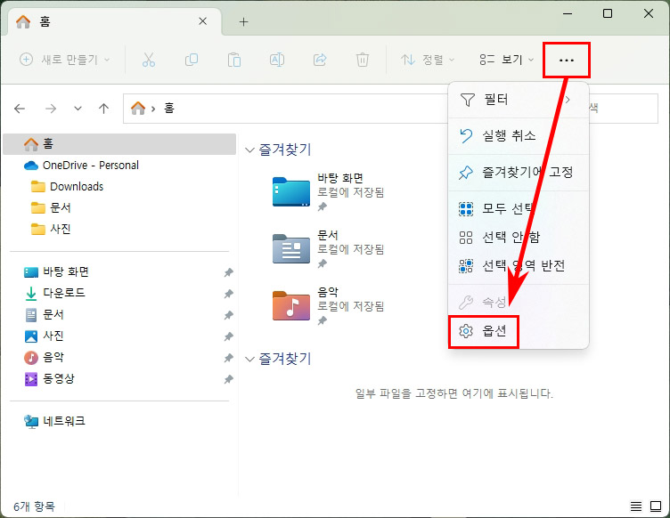 1. 윈도우11에서 일단 아무 폴더나 열어 줍니다. 폴더에서 더 보기 버튼 클릭 후 옵션을 클릭합니다.