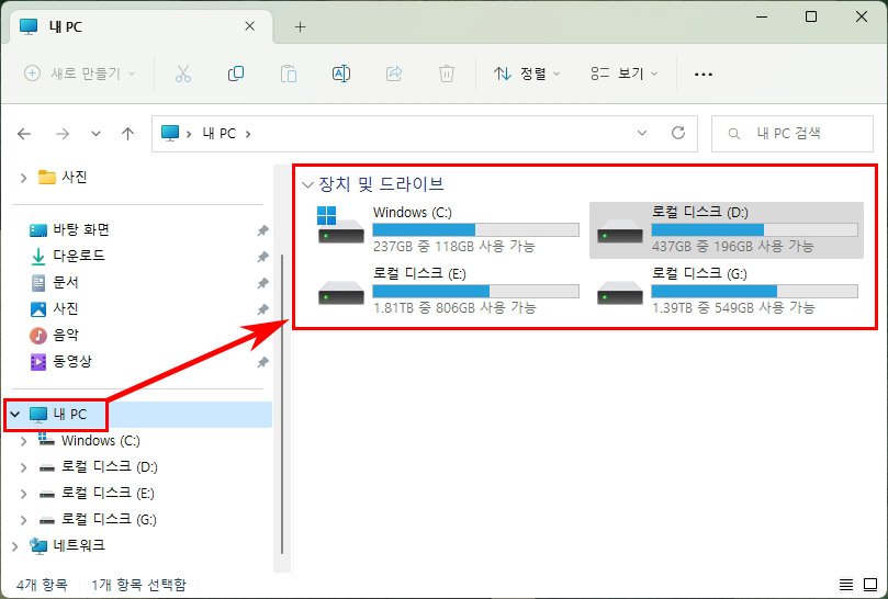 3. 내 PC를 클릭하면 장치 및 드라이브를 한 눈에 확인할 수 있습니다.