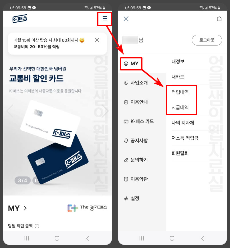 K패스 적립내역 및 지급내역 확인하기