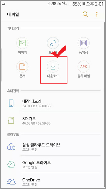 "내 파일" 앱에 들어가면 "다운로드" 버튼이 바로 나옵니다. 클릭하면 삼성 인터넷에서 받은 파일들이 이곳에 모여 있습니다.