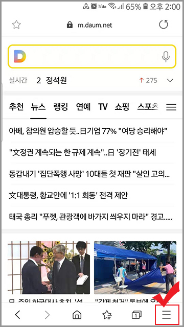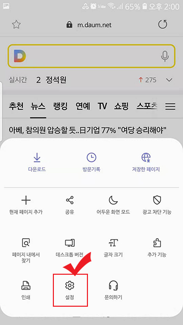 삼성 인터넷 어플을 켜고 들어갑니다. 인터넷을 켜면 오른쪽 밑에 설정 버튼이 있습니다.